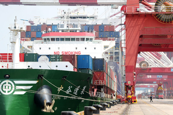 一艘貨輪在青島港前灣聯(lián)合集裝箱碼頭裝載貨物。新華社發(fā)(張進(jìn)剛 攝)