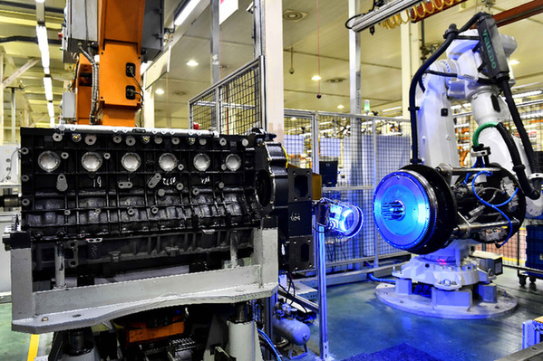 在位于山東濰坊的濰柴集團(tuán)總裝車間,機(jī)器人在流水線上裝配發(fā)動(dòng)機(jī)。記者 郭緒雷 攝