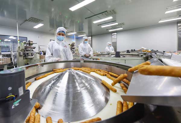 河北邱縣一家面包生產(chǎn)企業(yè)工人在生產(chǎn)車間工作。