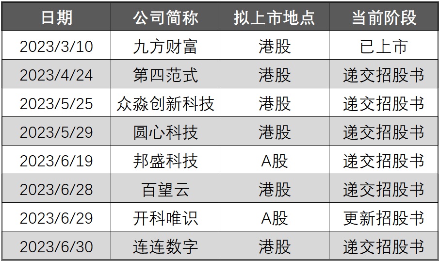 3月10日,在線投資決策解決方案提供商九方財富登陸港交所,打響了2023年國內(nèi)金融科技公司上市“頭炮”。公開資料顯示,九方財富的控股股東為銀科控股,具有投顧牌照。隨后的4月24日,起步于金融行業(yè)AI服務的第四范式向港交所遞交了招股書;5月25日,海爾旗下的數(shù)字化保險代理服務及解決方案提供商眾淼創(chuàng)新科技向港交所遞交招股書;5月29日,綜合醫(yī)療服務平臺圓心科技更新了港股招股書,旗下的圓心惠保為保險公司提供技術(shù)賦能服務;6月28日,企業(yè)數(shù)字化解決方案提供商百望云向港交所遞交招股書,公司通過百望云平臺提供財稅數(shù)字化及數(shù)據(jù)驅(qū)動的智能解決方案;6月30日,數(shù)字支付及增值服務提供商連連數(shù)字首次向港交所遞表,該公司也是率先在全球范圍內(nèi)提供全面支付解決方案的中國公司之一。