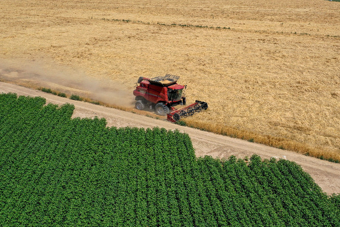 在新疆呼圖壁縣五工臺(tái)鎮(zhèn)小泉村,農(nóng)機(jī)手駕駛聯(lián)合收割機(jī)收割小麥(7月15日攝,無(wú)人機(jī)照片)。
