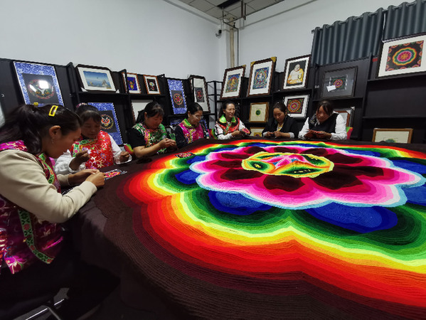 青繡數(shù)字化經(jīng)濟(jì)總部刺繡車間,繡娘們正在制作土族盤繡。