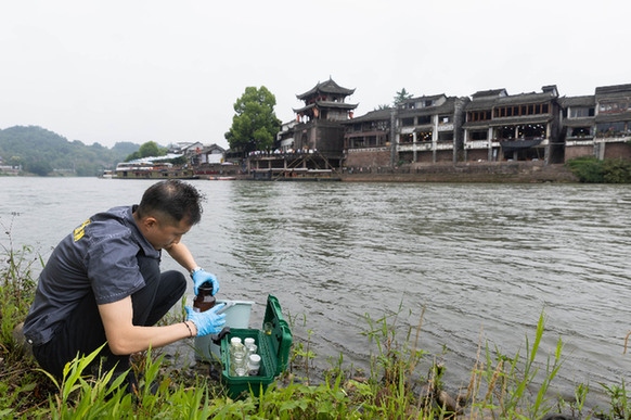 成都市生態(tài)環(huán)境監(jiān)測中心站現(xiàn)場監(jiān)測人員在錦江黃龍溪古鎮(zhèn)段提取水樣。資料照片