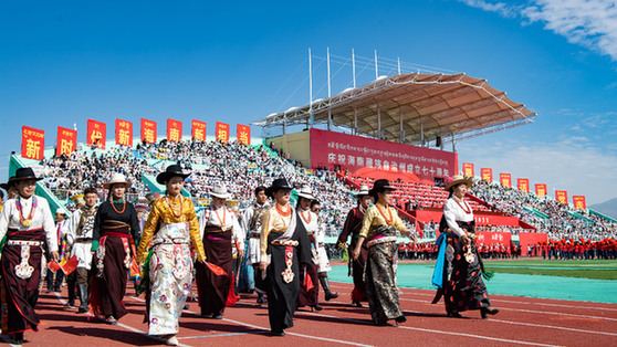 8月1日,青海省海南藏族自治州舉行慶祝成立70周年大會。海南州民族體育場彩旗飄飄,歌聲悠揚(yáng),各族群眾身著盛裝,滿懷喜悅。新華社記者 解統(tǒng)強(qiáng) 攝