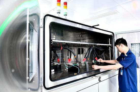 6月6日,在棗莊市國家鋰電池產(chǎn)品質(zhì)量檢驗(yàn)檢測中心,工作人員對鋰電池進(jìn)行檢驗(yàn)。 新華社記者 郭緒雷 攝