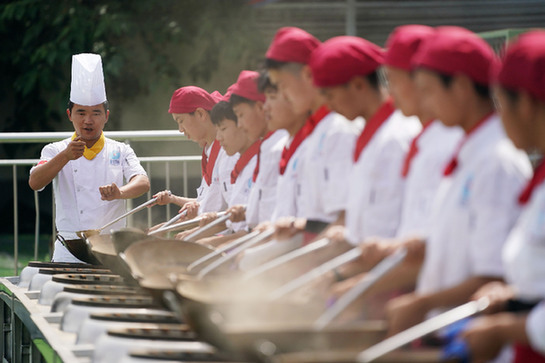 在位于西安市藍(lán)田縣的藍(lán)田廚師學(xué)校,教師成曉強(左一)指導(dǎo)學(xué)生們練習(xí)翻勺。新華社記者 李一博 攝