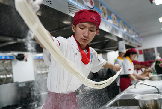 在位于西安市藍(lán)田縣的藍(lán)田廚師學(xué)校中式面點實訓(xùn)室,學(xué)生在練習(xí)制作面條。新華社記者 李一博 攝
