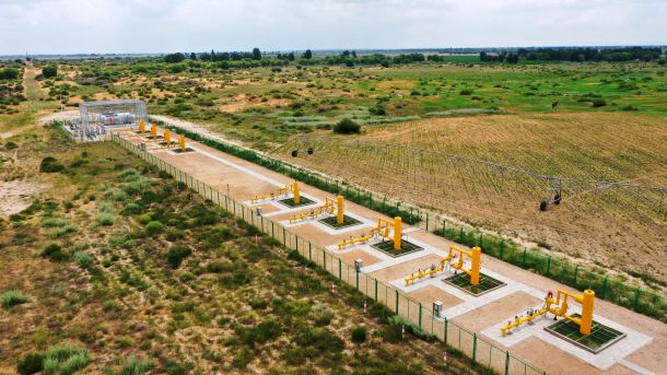 中國石油長慶油田蘇里格南作業(yè)分公司的無人值守智能遠(yuǎn)程開關(guān)叢式井組(無人機(jī)照片)。記者 王鵬 攝
