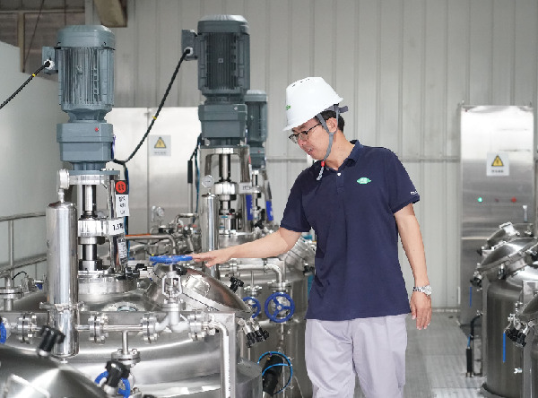 在北京微構(gòu)工場生物技術有限公司中試車間,工作人員查看配料罐的工作情況。