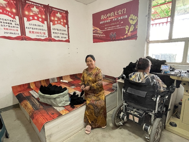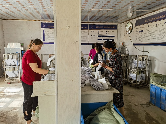 位于新疆生產(chǎn)建設兵團第三師51團4連圖木休克鎮(zhèn)的朱力姑·阿布拉家,15位維吾爾族女性按照縫頭、翻襪、定型等流水線有條不紊地進行著棉襪后道工序生產(chǎn)。