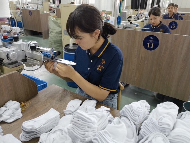 經(jīng)過近三年的建設,產(chǎn)業(yè)園已建成13個車間,共5960臺襪機裝備完畢投產(chǎn),職工人數(shù)已達1200多人,日產(chǎn)250萬雙棉襪,2022年總產(chǎn)值突破3億元,全球有主要客戶115家,產(chǎn)品主要外貿(mào)合作國家22個,已經(jīng)成為全球單體生產(chǎn)規(guī)模最大的襪業(yè)企業(yè)之一。
