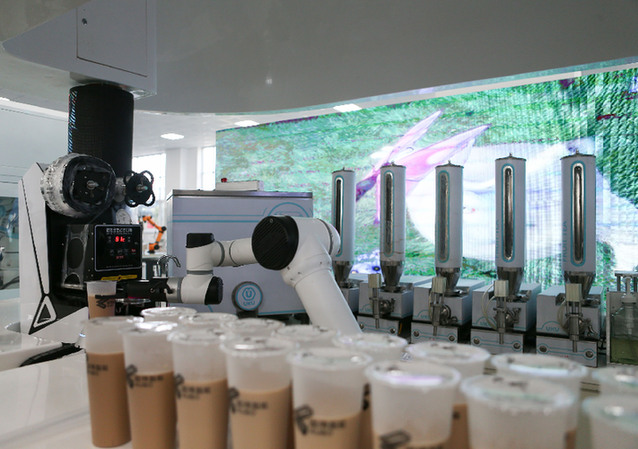 淄博市臨淄區(qū)的遨博(山東)智能機(jī)器人有限公司,機(jī)器人在制作奶茶。新華社記者 張浩波 攝