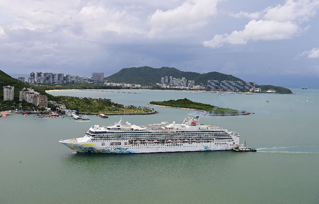9月25日,發(fā)自香港、搭載1800多名旅客的“名勝世界壹號(hào)”郵輪順利靠泊三亞國際郵輪港碼頭,標(biāo)志著三亞口岸國際郵輪航線正式復(fù)航。圖為當(dāng)日“名勝世界壹號(hào)”郵輪緩緩駛進(jìn)三亞港。