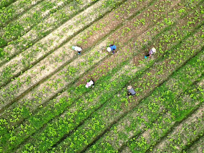 秋日里,農(nóng)民忙著秋收秋管,鄉(xiāng)村田野一派繁忙景象。圖為9月26日村民在貴州省黔東南苗族侗族自治州榕江縣車江壩區(qū)蔬菜基地進(jìn)行田間管理(無人機(jī)照片)。