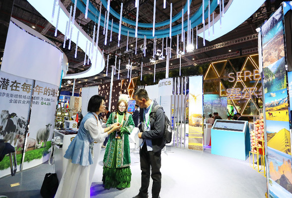 11月6日,一名參觀者(右)在第六屆進博會國家展哈薩克斯坦展臺與工作人員交談。第六屆進博會國家展全面恢復線下舉辦,洪都拉斯、塞爾維亞、越南、南非、哈薩克斯坦作為本屆進博會主賓國在國家展亮相。 新華社記者 方喆 攝