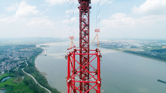 在湖北黃石陽新縣,國網(wǎng)湖北電力員工正在組立武漢—南昌1000千伏特高壓工程長江大跨越段南岸跨越塔。鄒小民 攝