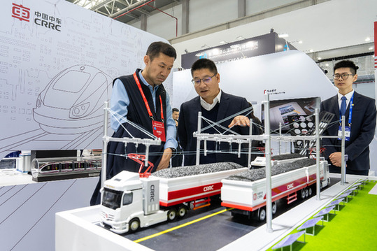 12月8日,在2023中國(guó)國(guó)際軌道交通和裝備制造產(chǎn)業(yè)博覽會(huì)上,觀眾(左一)了解一款智能貨車。新華社記者 陳思汗 攝