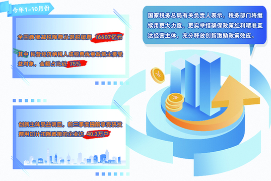 繼續(xù)對(duì)小規(guī)模納稅人減免增值稅、優(yōu)化研發(fā)費(fèi)用加計(jì)扣除政策、先進(jìn)制造企業(yè)增值稅加計(jì)抵減……今年以來(lái),相關(guān)部門(mén)分批次延續(xù)、優(yōu)化和完善近70項(xiàng)稅費(fèi)優(yōu)惠政策,有力激發(fā)經(jīng)營(yíng)主體活力,提升創(chuàng)新發(fā)展動(dòng)能。國(guó)家稅務(wù)總局最新數(shù)據(jù)顯示,今年1至10月份,全國(guó)新增減稅降費(fèi)及退稅緩費(fèi)16607億元,其中民營(yíng)經(jīng)濟(jì)納稅人成稅費(fèi)優(yōu)惠政策主要受益對(duì)象,金額占比近75%;創(chuàng)新主體受益明顯,前三季度提前享受研發(fā)費(fèi)用加計(jì)扣除政策的企業(yè)達(dá)40.3萬(wàn)戶(hù)。