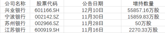 《經(jīng)濟(jì)參考報(bào)》記者注意到,11月以來(lái),除興業(yè)銀行外,寧波銀行、蘇州銀行、蘭州銀行等也相繼獲得股東增持。