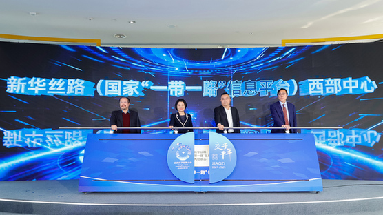 1月12日,在成都交子金融大會現(xiàn)場,嘉賓為“新華絲路西部中心”揭牌。 新華社記者 沈伯韓 攝