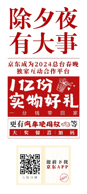 2月9日除夕夜,備受全球華人期待的中央廣播電視總臺(tái)《2024年春節(jié)聯(lián)歡晚會(huì)》(簡(jiǎn)稱“總臺(tái)春晚”)將正式與觀眾見(jiàn)面。作為總臺(tái)春晚獨(dú)家互動(dòng)合作平臺(tái),京東在攜手中央廣播電視總臺(tái)為全球華人帶來(lái)“文化年夜飯”的同時(shí),也將為海內(nèi)外觀眾送上1億份實(shí)物好禮,更有汽車使用權(quán)等驚喜大獎(jiǎng)數(shù)量再次加碼!與全球華人共同迎接甲辰龍年的到來(lái)。