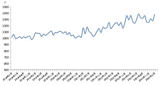 2月份,新華·中鹽食用鹽(商超)價(jià)格指數(shù)報(bào)1381.73點(diǎn),較上期(2024年1月)上漲101.15點(diǎn),漲幅7.90%;較基期(2018年1月)上漲381.73點(diǎn),漲幅38.17%;較周期內(nèi)最高點(diǎn)1387.12點(diǎn)(2023年6月)下跌5.39點(diǎn),跌幅0.39%;較周期內(nèi)最低點(diǎn)981.91點(diǎn)(2018年12月)上漲399.82點(diǎn),漲幅40.72%。