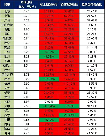 分價(jià)格區(qū)間來(lái)看,本期超市食用鹽銷售單價(jià)在5元/斤以上的城市有10個(gè),分別是北京、上海、呼和浩特、哈爾濱、蘭州、烏魯木齊、杭州、長(zhǎng)春、長(zhǎng)沙、昆明;超市食用鹽銷售單價(jià)在4-5元/斤之間的城市有6個(gè),分別是廣州、重慶、南昌、天津、西寧、濟(jì)南;超市食用鹽銷售單價(jià)在3-4元/斤之間的城市有5個(gè),分別是銀川、石家莊、南京、武漢、貴陽(yáng);超市食用鹽銷售單價(jià)在3元/斤以下的城市有7個(gè),分別是合肥、西安、南寧、鄭州、拉薩、太原、青島。
