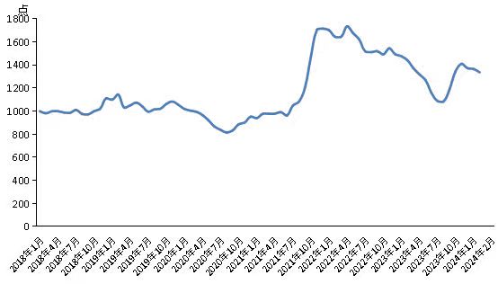 2月份,新華·中鹽兩堿工業(yè)鹽價格指數(shù)報1337.82點,較上期(2024年1月)下跌28.20點,跌幅2.06%;較基期(2018年1月)上漲337.82點,漲幅33.78%;較周期內(nèi)最高點1736.66點(2022年4月)下跌398.84點,跌幅22.97%;較周期內(nèi)最低點816.2點(2020年8月)上漲521.62點,漲幅63.91%。