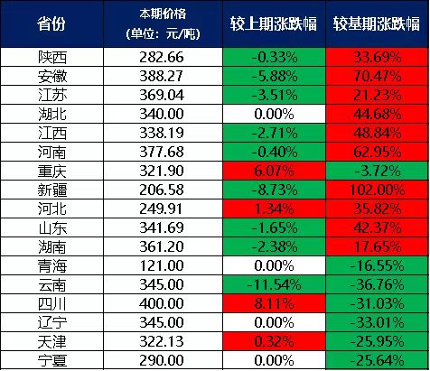 分價格區(qū)間來看,本期兩堿工業(yè)鹽單價在300元/噸以上的地區(qū)有12個,是安徽、江蘇、湖北、江西、河南、重慶、山東、湖南、云南、四川、遼寧、天津;兩堿工業(yè)鹽單價在300元/噸以下的地區(qū)有5個,分別是陜西、新疆、河北、青海、寧夏。