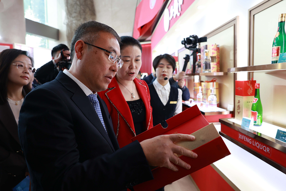 圖為陜西西鳳酒股份有限公司總經(jīng)理張周虎參觀產(chǎn)品展臺(tái)