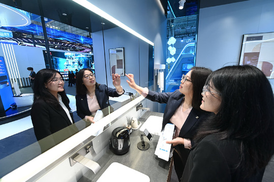 在第六屆數(shù)字中國(guó)建設(shè)成果展覽會(huì)上,參觀者現(xiàn)場(chǎng)了解一款衛(wèi)浴智能產(chǎn)品。記者 林善傳 攝