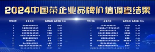 5月10日,“2024中國茶品牌建設(shè)論壇”在上海舉辦,中國茶葉流通協(xié)會、中國經(jīng)濟信息社發(fā)布了中國茶品牌價值調(diào)查結(jié)果,中茶公司以128.09億再獲“2024中國茶品牌Top50”榜首,成為唯一品牌價值過百億企業(yè)。