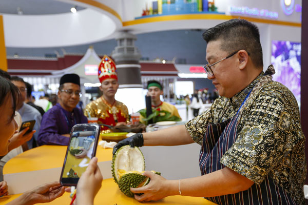 第八屆中國(guó)-亞歐博覽會(huì)國(guó)際展區(qū)云集了琳瑯滿目的各國(guó)特色商品,引人駐足。圖左:參觀者在巴基斯坦展臺(tái)選購首飾。圖中:馬來西亞展臺(tái)工作人員打開榴蓮供參觀者品嘗。圖右:參會(huì)嘉賓在吉爾吉斯斯坦展臺(tái)洽談。記者 陳朔 攝