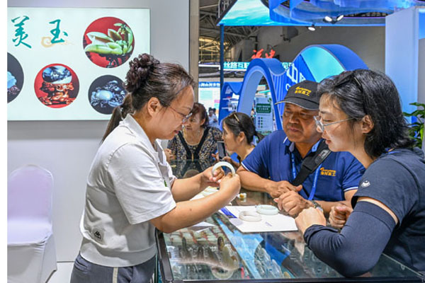6月30日,在第八屆中國(guó)-亞歐博覽會(huì)上,觀眾在選購和田玉。記者 陳朔 攝