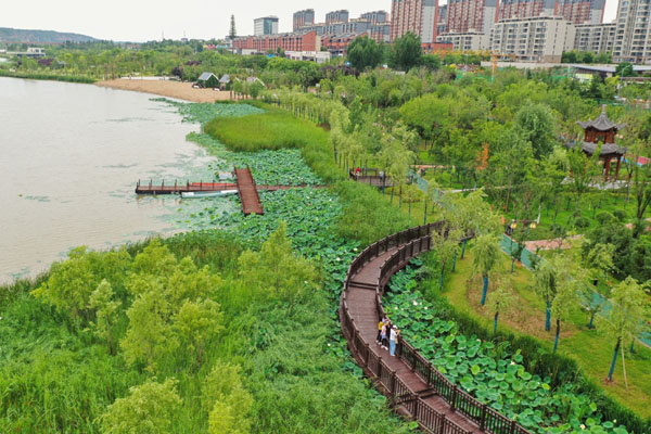 游人在富平石川河國家濕地公園岸邊景觀步道上觀景賞花(6月21日攝,無人機(jī)照片)。記者 李賀 攝