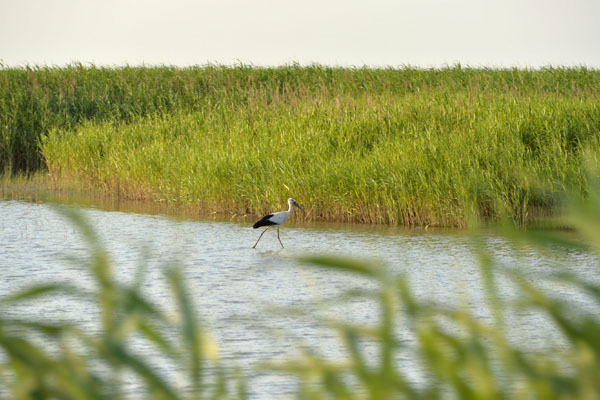 6月25日在山東東營拍攝的黃河三角洲國家級自然保護區(qū)的東方白鸛。記者 劉力航 攝