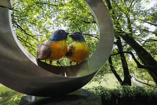 7月3日,在石門村拍攝的藍冠噪鹛雕塑。 記者 杜瀟逸 攝