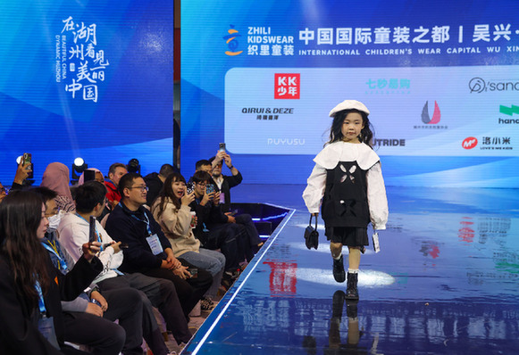 織里鎮(zhèn)某童裝類活動(dòng)上,童模正在展示新款童裝。資料照片