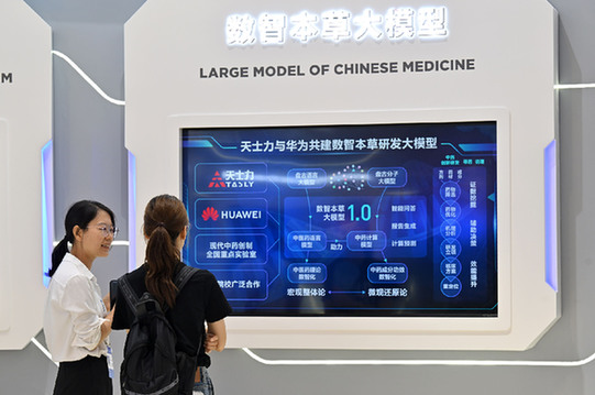 觀眾在2024世界智能產(chǎn)業(yè)博覽會上的天士力展區(qū)了解數(shù)智本草大模型。 記者 李然 攝