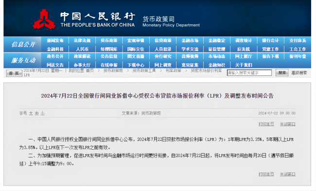 中國(guó)人民銀行授權(quán)全國(guó)銀行間同業(yè)拆借中心公布,2024年7月22日貸款市場(chǎng)報(bào)價(jià)利率(LPR)為:1年期LPR為3.35%,5年期以上LPR為3.85%,與此前相比均同步下降10個(gè)基點(diǎn)。