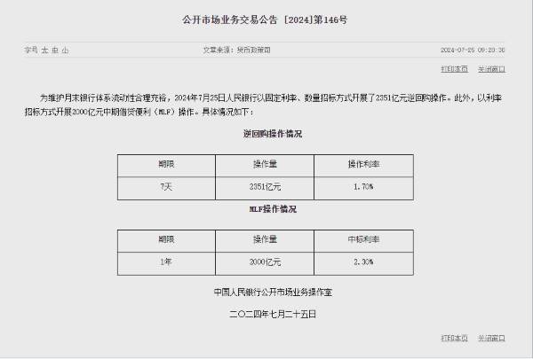 7月25日,央行月內(nèi)第二次開展MLF(中期借貸便利)操作,操作量2000億元,并明確采用利率招標方式,本次中標利率2.3%,較前次下降0.2個百分點。