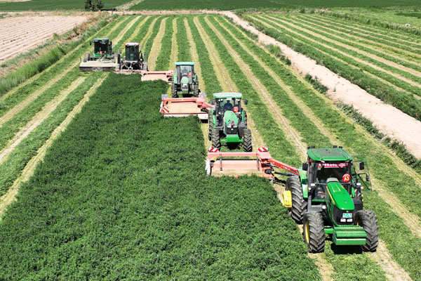 眼下,在巴彥淖爾市磴口縣包爾蓋農(nóng)場有機(jī)苜蓿產(chǎn)業(yè)園區(qū)內(nèi),5.8萬畝紫花苜蓿迎風(fēng)搖曳,自走式割草機(jī)等大型機(jī)械來回穿梭,呈現(xiàn)一派繁忙的收獲景象。該園區(qū)負(fù)責(zé)人路建平說,他們通過優(yōu)化品種種植結(jié)構(gòu),大幅提升飼草畝均效益,確保苜蓿營養(yǎng)成分優(yōu)、品質(zhì)好、產(chǎn)量高,平均畝產(chǎn)1000千克左右。
