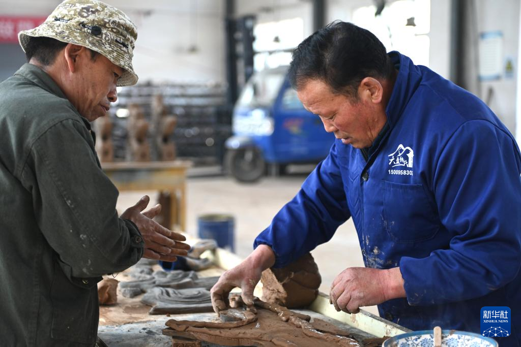10月30日,在固原市隆德縣魏氏磚雕傳承基地,卜文俊(右)在生產(chǎn)車間對工人進(jìn)行指導(dǎo)。