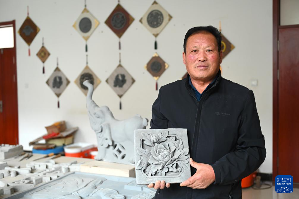 10月30日,在固原市隆德縣魏氏磚雕傳承基地,卜文俊在刷去磚雕作品上的磚灰。