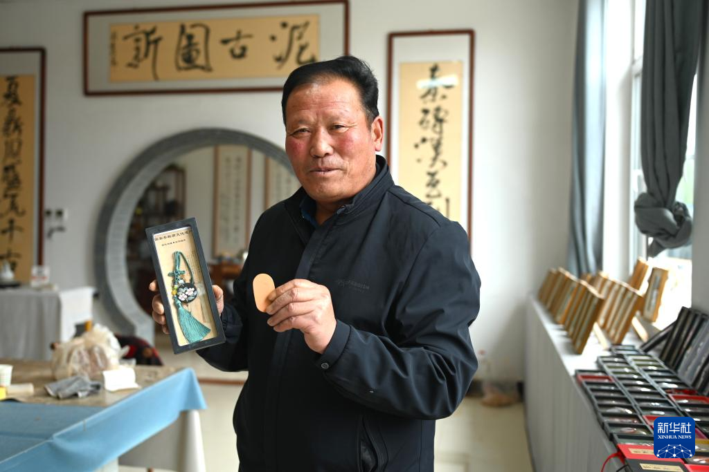 10月30日,在固原市隆德縣魏氏磚雕傳承基地,卜文俊在展示磚雕文創(chuàng)產(chǎn)品。