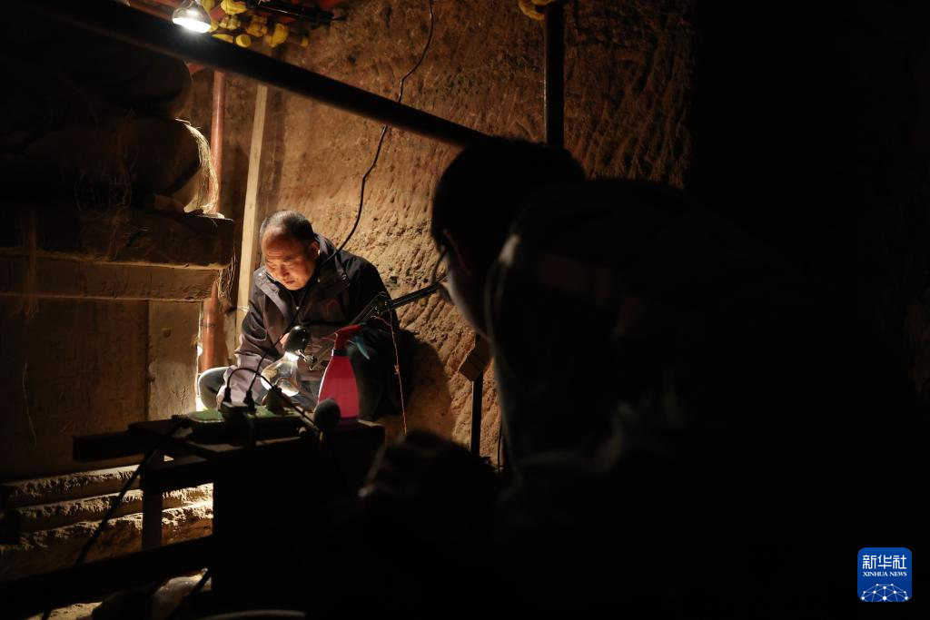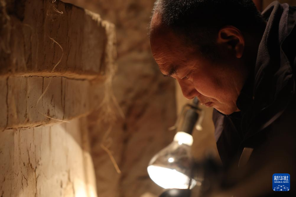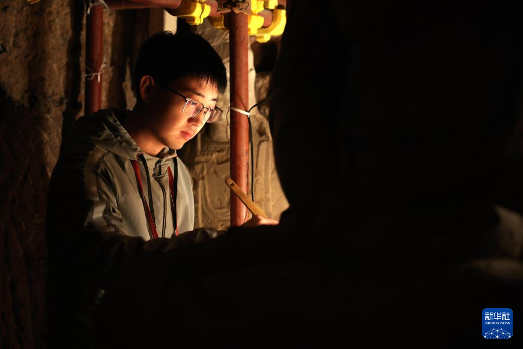麥積山石窟藝術(shù)研究所保護(hù)研究室文物修復(fù)師牟常有在麥積山石窟133窟內(nèi)查看塑像(11月2日攝)。