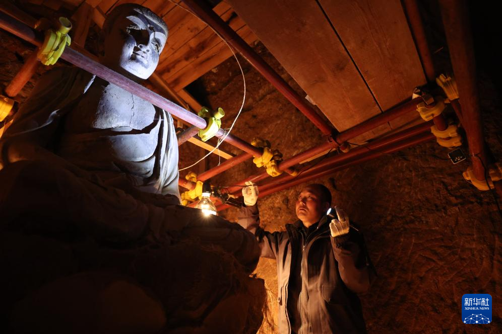 麥積山石窟藝術(shù)研究所保護(hù)研究室文物修復(fù)師何舉在麥積山石窟133窟內(nèi)修復(fù)塑像(11月2日攝)。