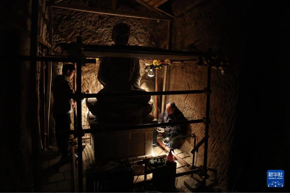 麥積山石窟藝術(shù)研究所保護(hù)研究室文物修復(fù)師牟常有(右)和何舉在麥積山石窟133窟內(nèi)修復(fù)塑像(11月2日攝)。