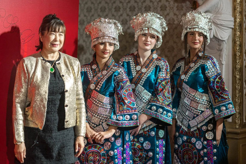 與會嘉賓與身著中國苗族服飾的迎賓人員合影