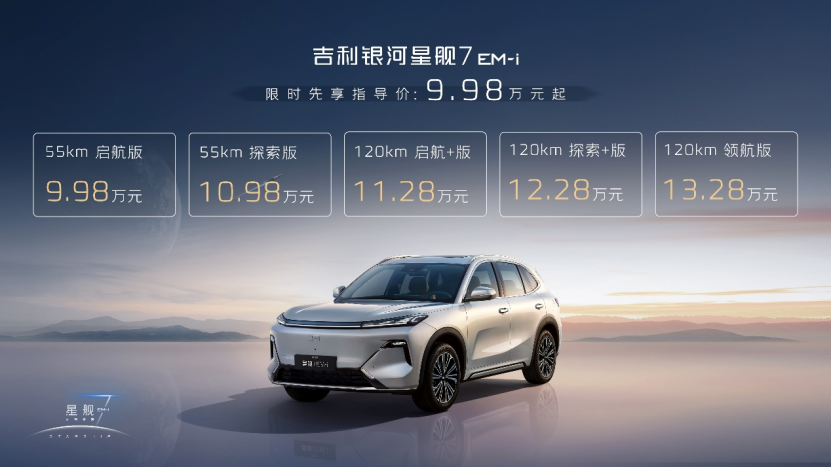 12月6日,吉利銀河全新A級電混SUV——“新一代國民精品SUV”吉利銀河星艦7EM-i(簡稱吉利銀河星艦7)在吉利汽車夢想啟航的地方——浙江臺(tái)州正式上市。新車共推出五個(gè)版型,分別是120km領(lǐng)航版、120km探索+版、120km啟航+版、55km探索版、55km啟航版,限時(shí)先享指導(dǎo)價(jià)為9.98萬元—13.28萬元。即日起,用戶可通過吉利銀河APP、微信小程序、抖音小程序及官網(wǎng)等官方渠道下訂,下訂用戶可享限時(shí)免費(fèi)享價(jià)值8800元的Flyme Sound無界之聲、限時(shí)免費(fèi)享價(jià)值1200-3000元配置、限時(shí)享8萬24期0息、不限品牌的4000元置換補(bǔ)貼等豐厚購車權(quán)益。